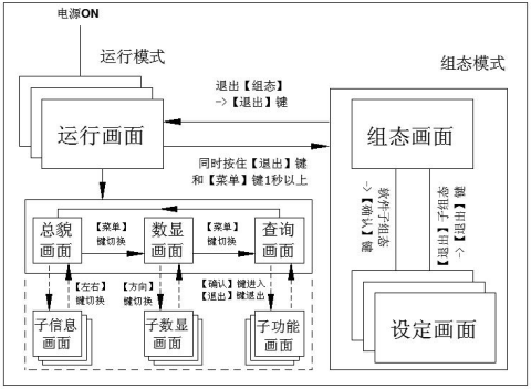 退出鍵+菜單鍵:組態(tài)復(fù)合鍵,同時按住1秒及以上,進入組態(tài)畫面。